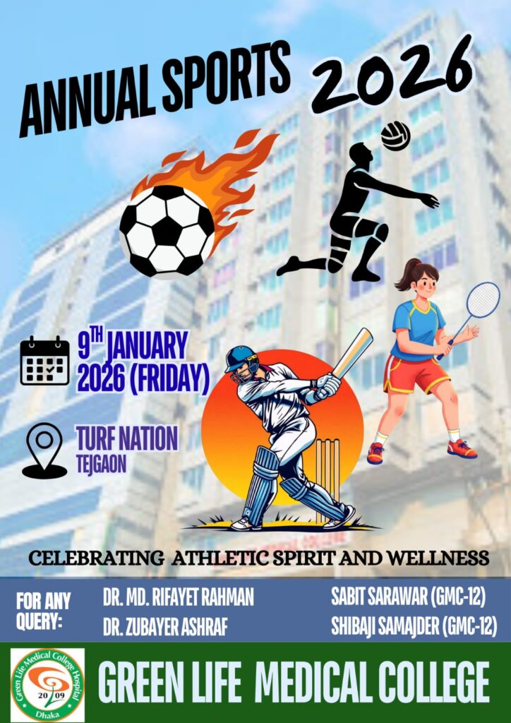 The Green Life Medical College Annual Sports 2026 (students) is finally here. We cordially invite you to join us at venue to cheer on the students.