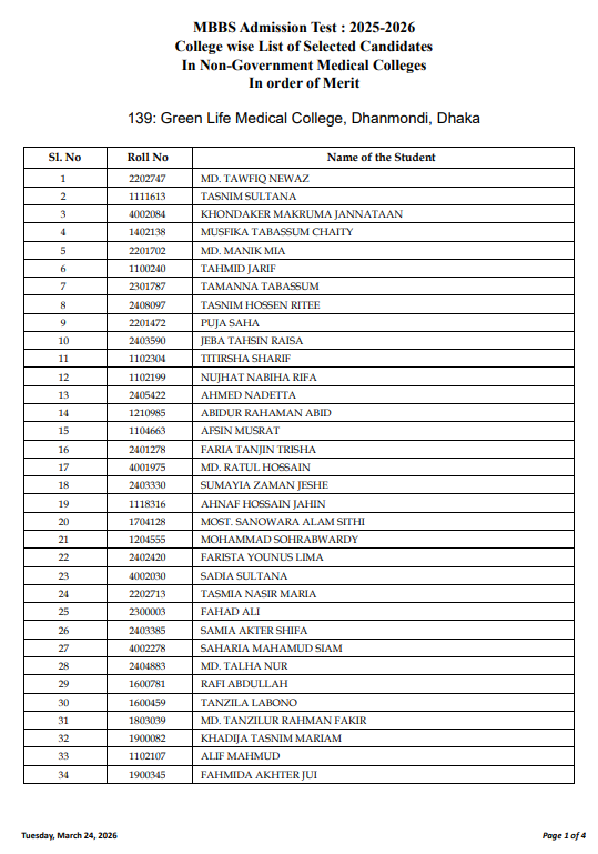 MBBS Admission Test : 2025-2026 List of Selected Candidates News Notice 26 March 202628 March 2026Sanower Hossain MBBS Admission Test : 2025-2026 List of Selected Candidates in Green Life Medical College, Dhanmondi, Dhaka. PDF